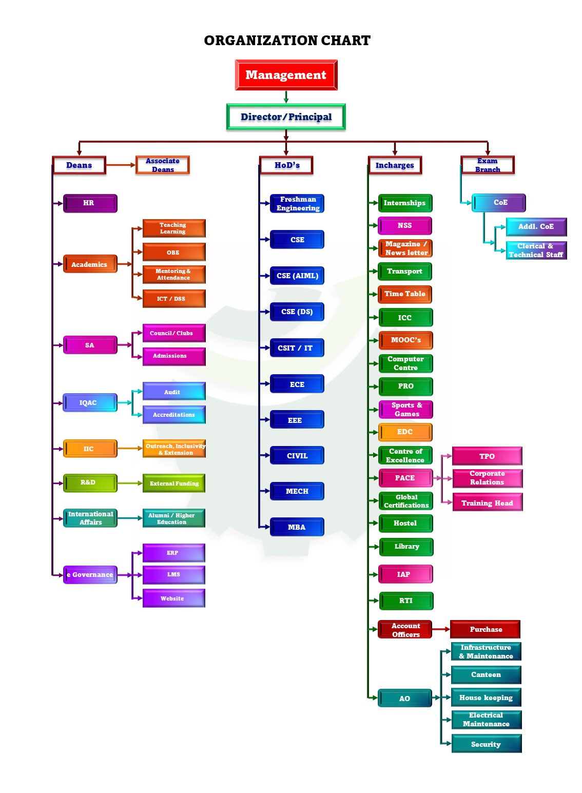 The organizational framework ensures structured and collaborative governance led by the Director/Principal, integrating Deans, Associate Deans, Heads of Departments, and Incharges across Engineering, Management, and Sciences for efficient institutional functioning.